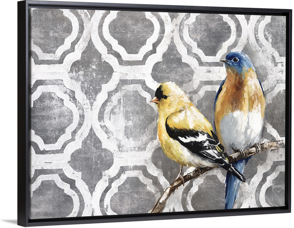 <p>Two birds perched on a small branch against a circular tile moroccan pattern.</p>