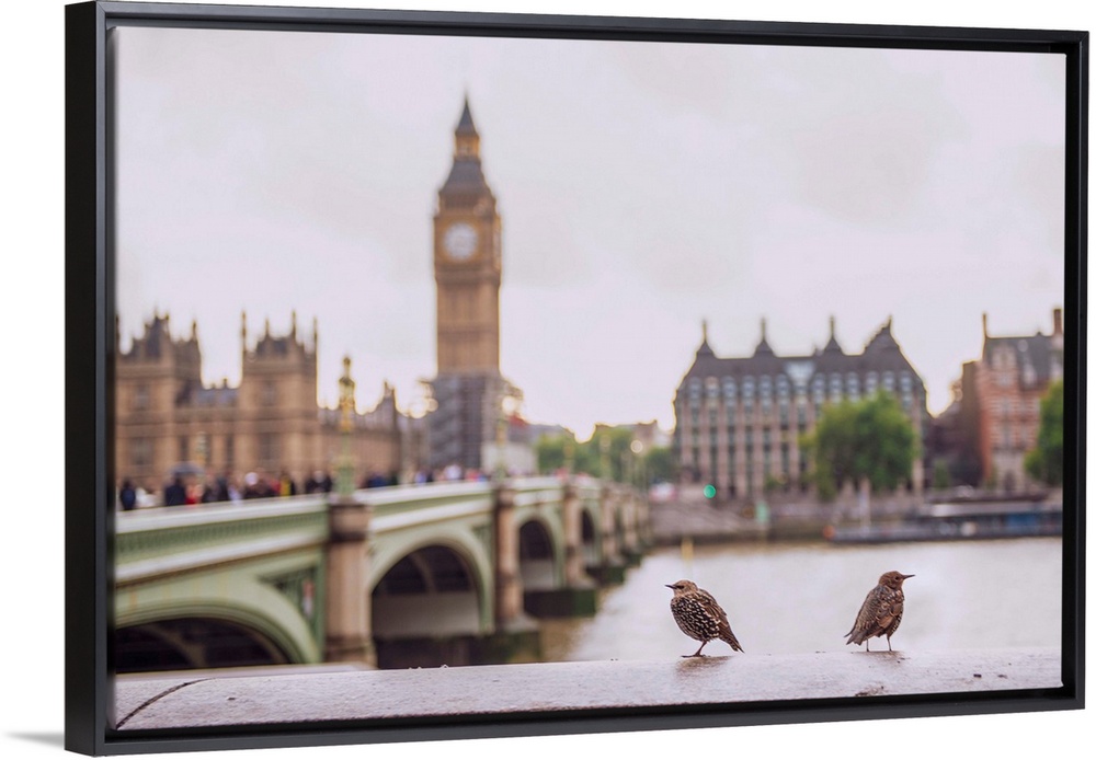 <p>Photograph of two birds perched on a ledge in front of the River Thames with Big Ben blurred in the background.</p>