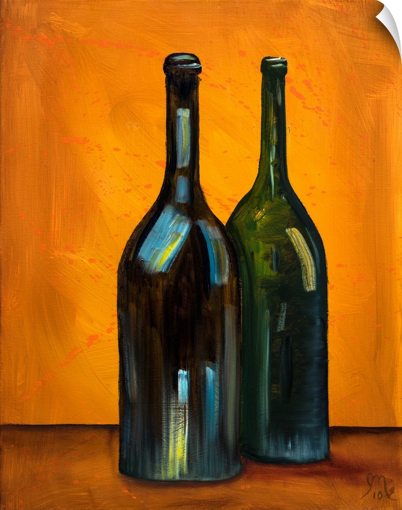<p>Contemporary painting of two wine bottles on an orange background with a little bit of orange paint splatter.</p>