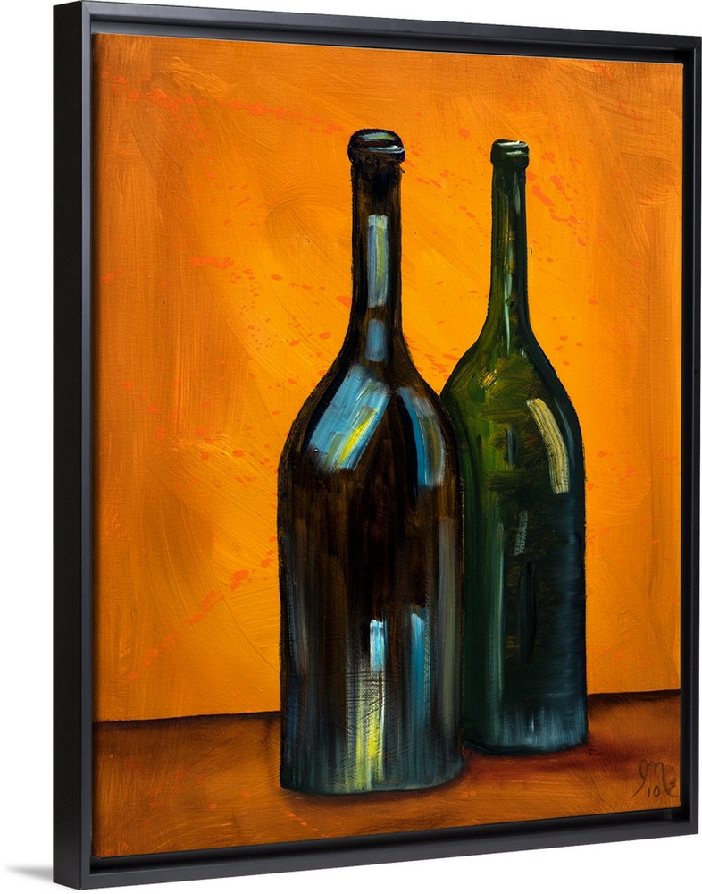 <p>Contemporary painting of two wine bottles on an orange background with a little bit of orange paint splatter.</p>