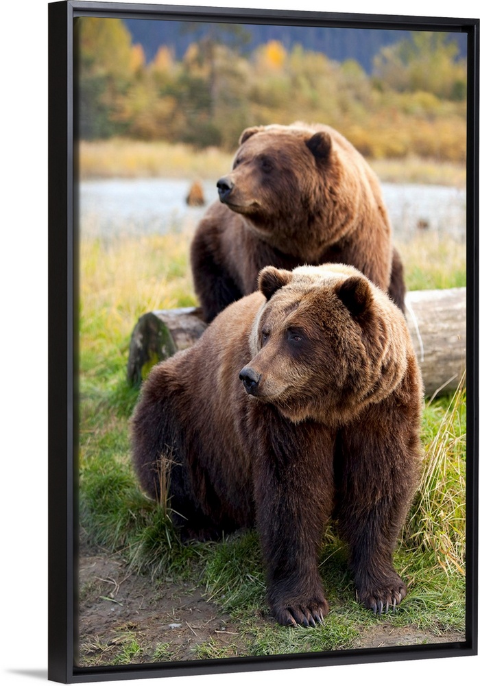 <p>Two Brown bears sitting near log at the Alaska Wildlife Conservation Center, Southcentral Alaska</p>