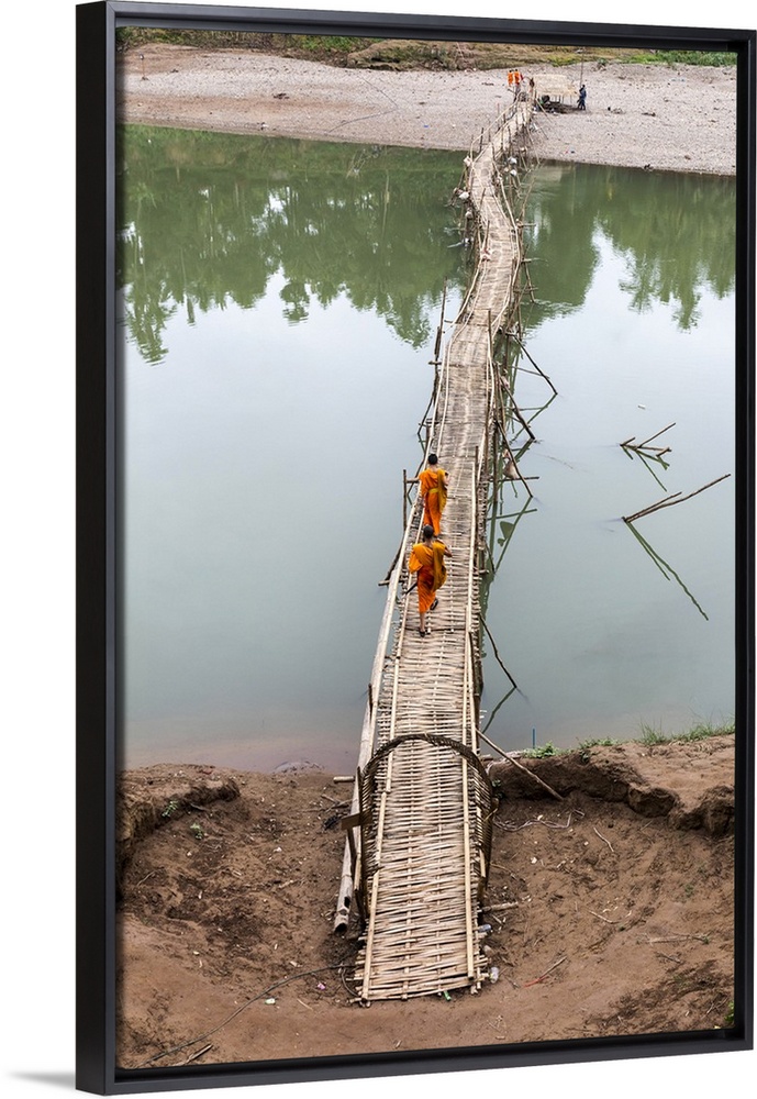 <p>Two buddhist monks walk across bamboo bridge, Luang Prabang, Louangphabang Province, Laos</p>