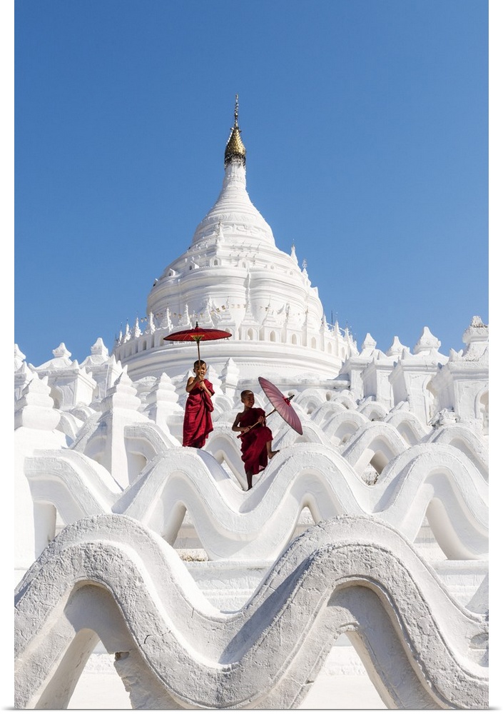 <p>Two Buddhist novice monks on the white pagoda of Hsinbyume (Myatheindan) paya temple, Mingun, Sagaing region, Myanmar</p>