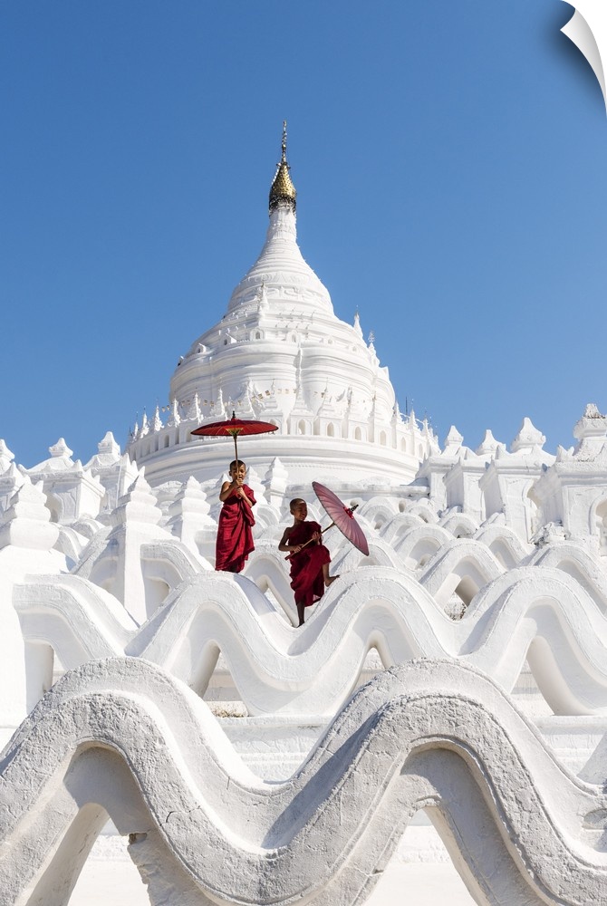 <p>Two Buddhist novice monks on the white pagoda of Hsinbyume (Myatheindan) paya temple, Mingun, Sagaing region, Myanmar</p>
