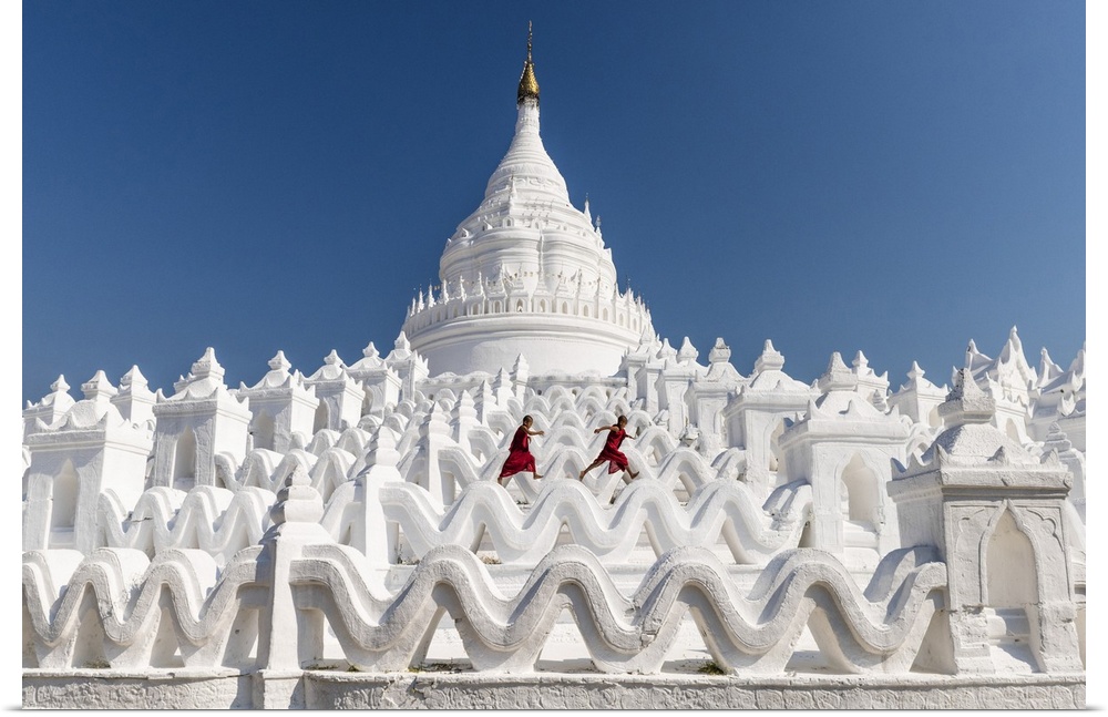 <p>Two Buddhist novice monks on the white pagoda of Hsinbyume (Myatheindan) paya temple, Mingun, Sagaing region, Myanmar</p>