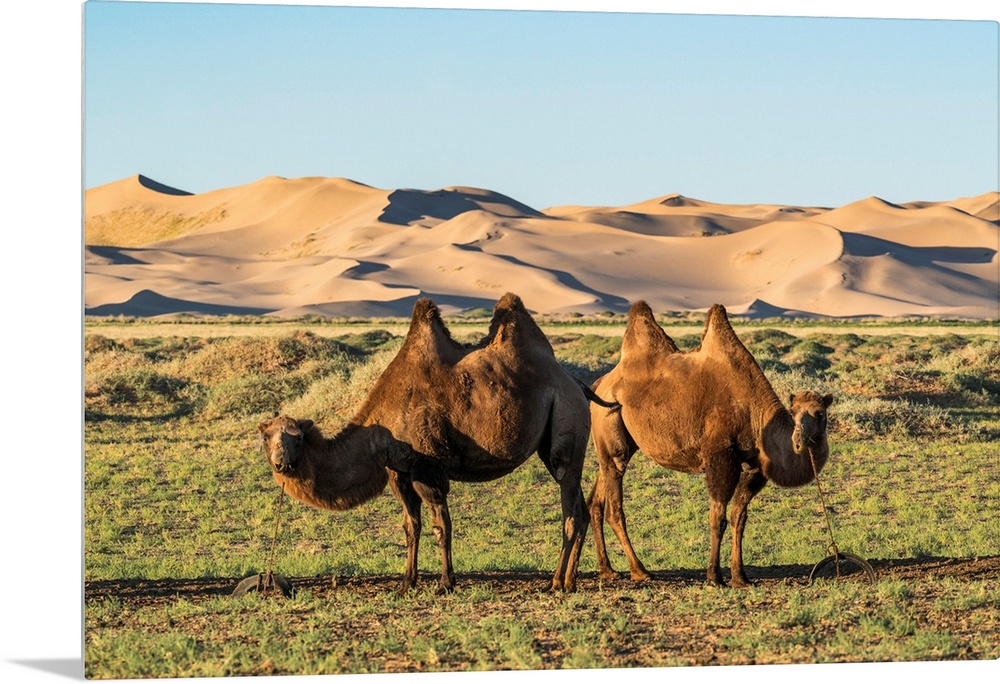 <p>Two Camels And Sand Dunes Of Gobi Desert In The Background. Sevrei District, South Gobi Province, Mongolia.</p>