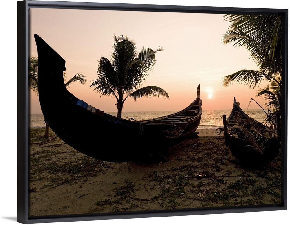 <p>Two canoes on the beach at the Arabian Sea, Kerala, India</p>