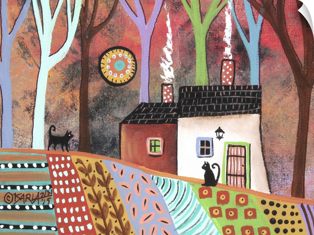 <p>Contemporary folk-art style painting of a rolling hill landscape with houses and patchwork fields.</p>