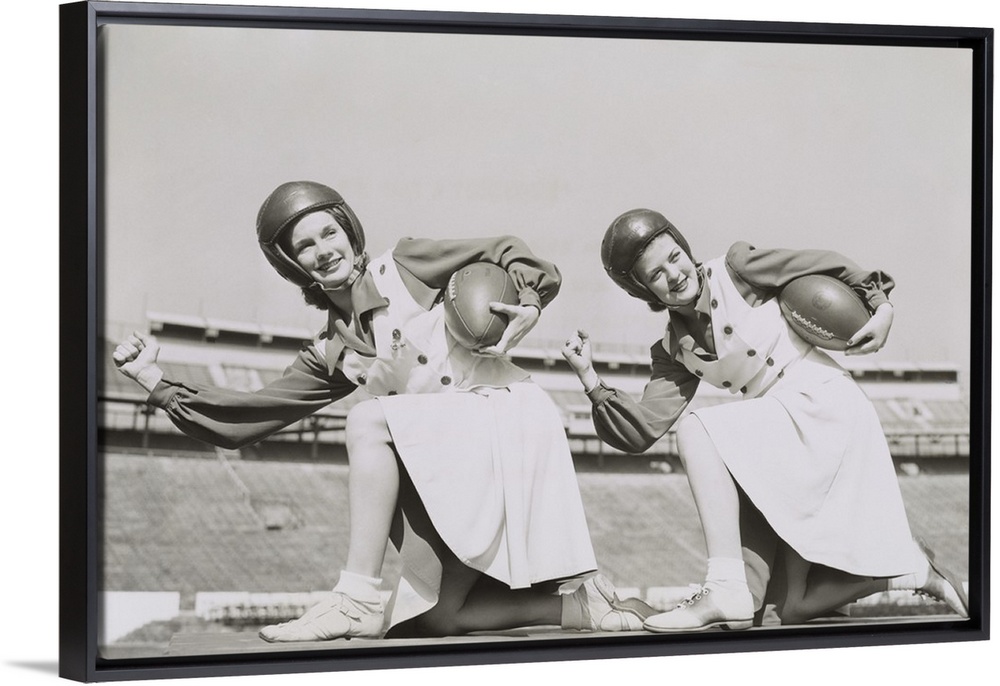<p>Two cheerleaders from Tulane University, Oct. 5, 1942. They are wearing football helmets and holding footballs.</p>