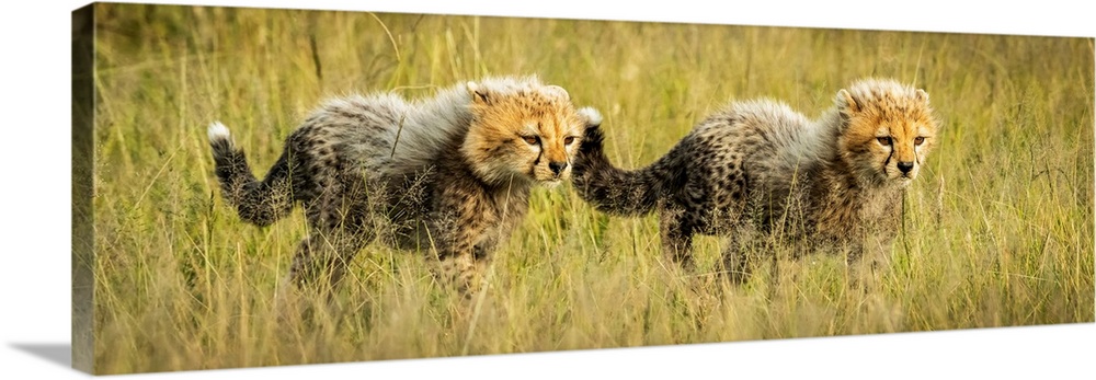 <p>Panorama of two cheetah cubs (acinonyx jubatus) walking together, Grumeti Serengeti tented camp, Serengeti national park, Tanzania.</p>