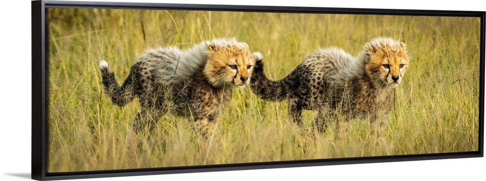 <p>Panorama of two cheetah cubs (acinonyx jubatus) walking together, Grumeti Serengeti tented camp, Serengeti national park, Tanzania.</p>