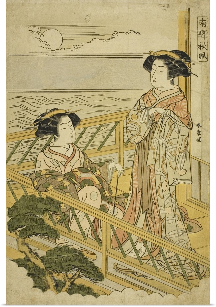 <p>Two Courtesans on a Moonlit Balcony at a House of Pleasure in Shinagawa, from the series Nan'eki Shufu, c.1774, colour woodblock print.</p>