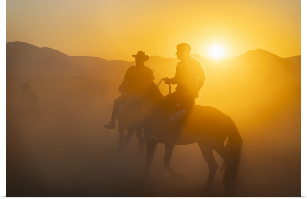 <p>Two cowboys on horses at sunset, Hacilar, Kayseri, Cappadocia, Anatolia, Turkey, Asia Minor, Asia</p>