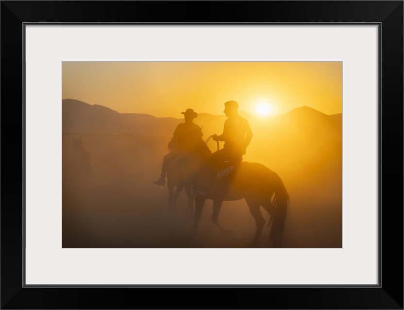 <p>Two cowboys on horses at sunset, Hacilar, Kayseri, Cappadocia, Anatolia, Turkey, Asia Minor, Asia</p>