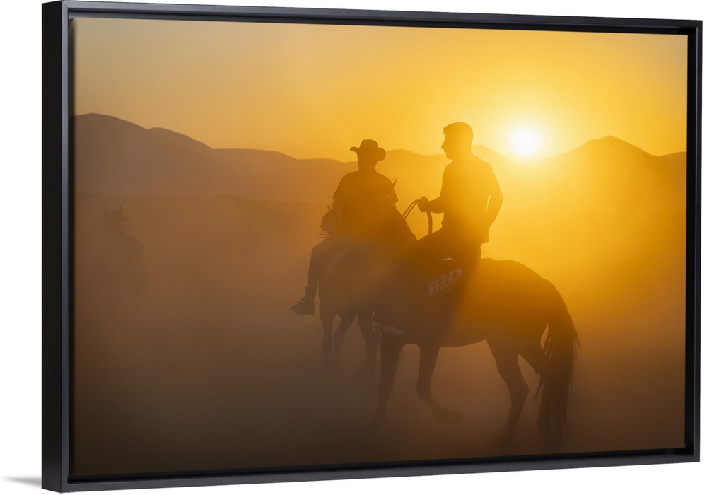 <p>Two cowboys on horses at sunset, Hacilar, Kayseri, Cappadocia, Anatolia, Turkey, Asia Minor, Asia</p>