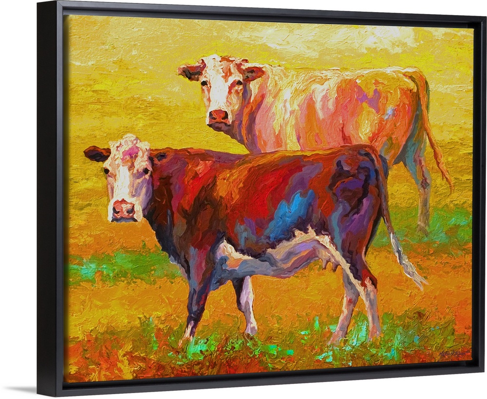 <p>A pair of cows looking forward on a brightly-painted landscape.</p>