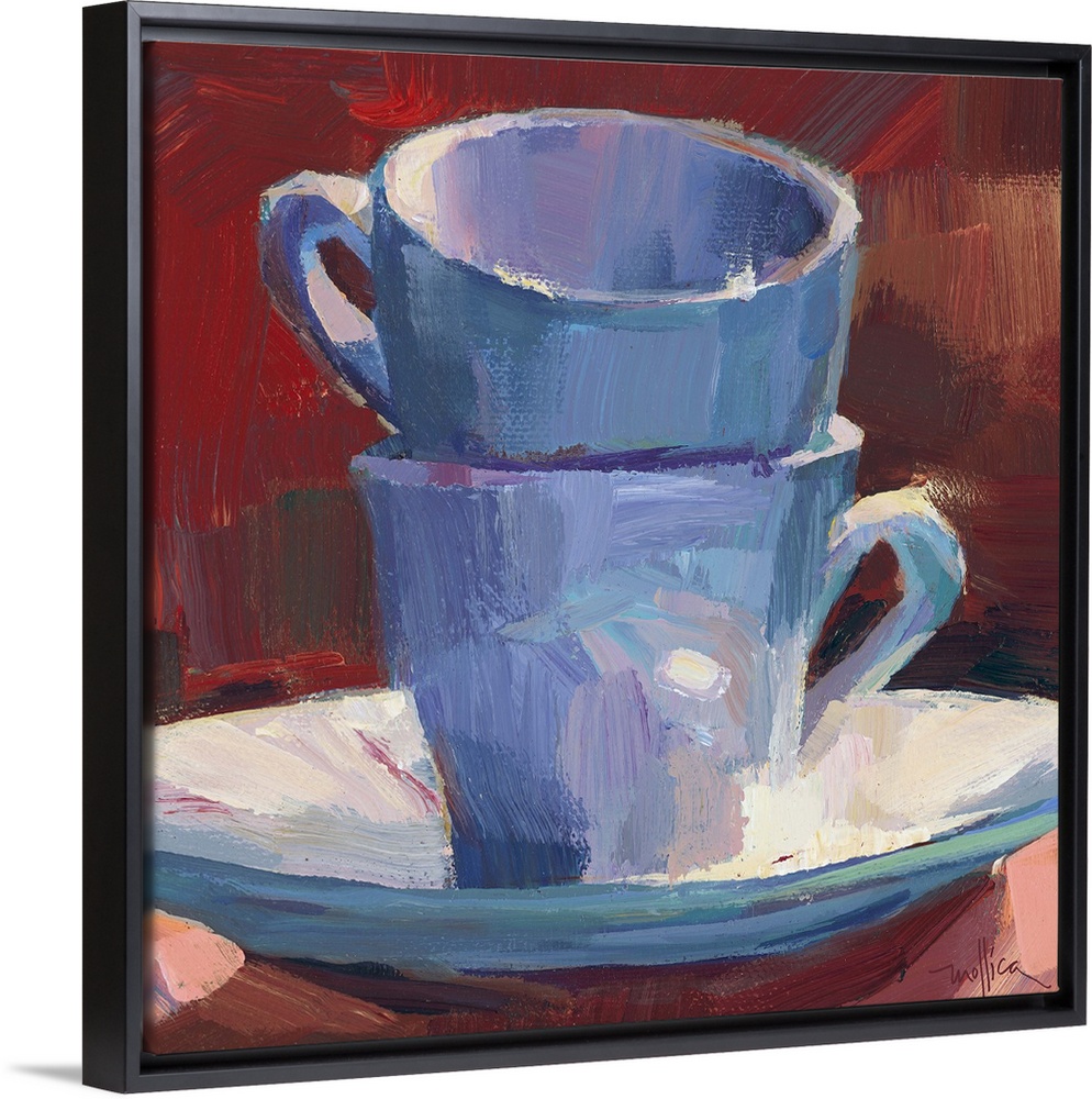 <p>Contemporary painting of teacups stacked on a teacup saucer against a red background.</p>