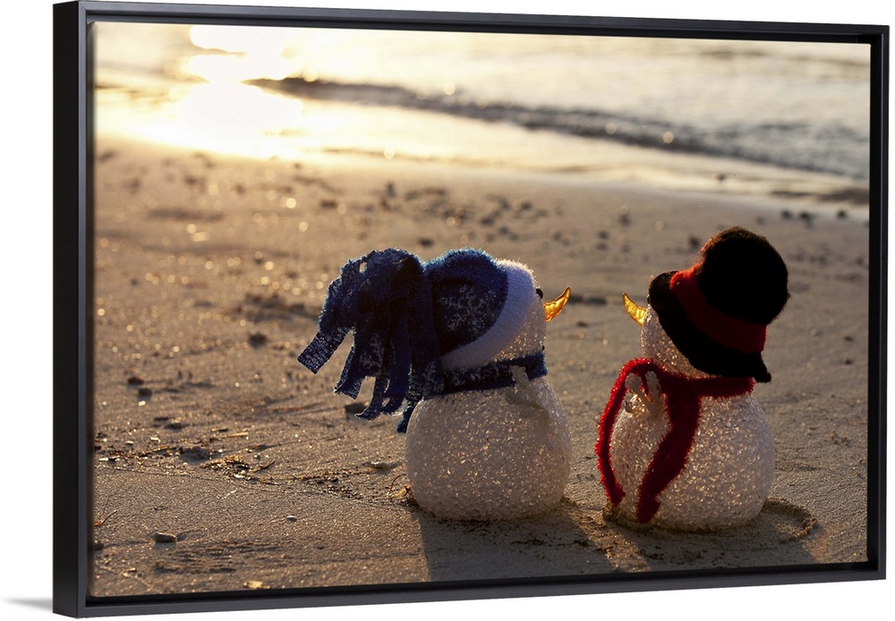 <p>Two snowmen look to the sea at sunset. White sand and waves in the background. View from behind. Christmas decorations. Blue and red hat and scarf.</p>