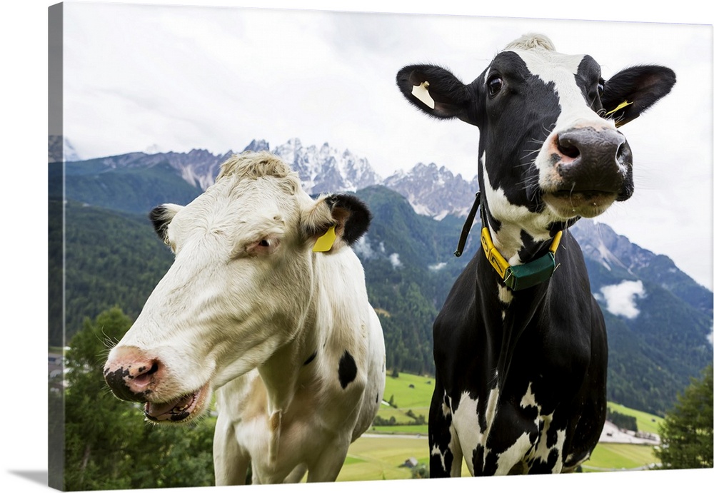 <p>Close-up of two diary cows in an alpine meadow with snow-capped mountains in the background; San Candido, Bolzano, Italy</p>