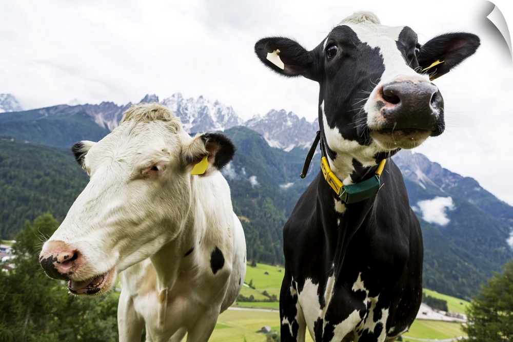 <p>Close-up of two diary cows in an alpine meadow with snow-capped mountains in the background; San Candido, Bolzano, Italy</p>