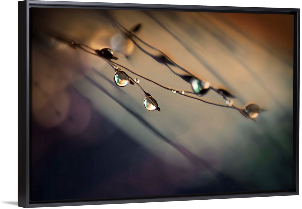 <p>Fine art photo of water droplets clinging to very thin twigs with a bokeh background.</p>