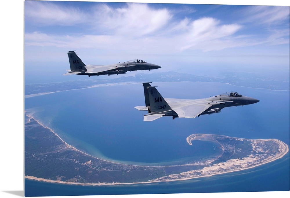<p>Two F-15 Eagles from the Massachusetts Air National Guard fly high over Cape Cod during a training mission.</p>