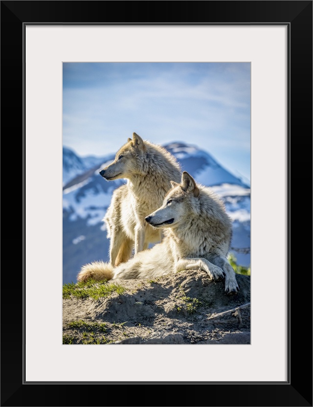 <p>Two female Gray wolves (Canis lupus) looking out with a mountain in the background, Alaska Wildlife Conservation Center; Portage, Alaska, United States of America</p>