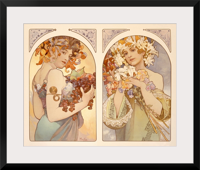 <p>This exquisite Art Nouveau illustration is by Alphonse Mucha, master of decorative poster design. It depicts two allegorical female figures-one holding an abundant harvest of fruit, the other cradling a bouquet of lilies and irises. Their flowing hair, delicate expressions, and richly detailed garments embody Mucha's signature style of idealized beauty, organic lines, and harmonious composition. Left figure (Autumn/Fruitfulness): Grapes, pears, and apples suggest abundance, sensuality, and nature's bounty. Right figure (Spring/Floral beauty): Lilies and soft hues evoke purity, rebirth, and grace.</p>