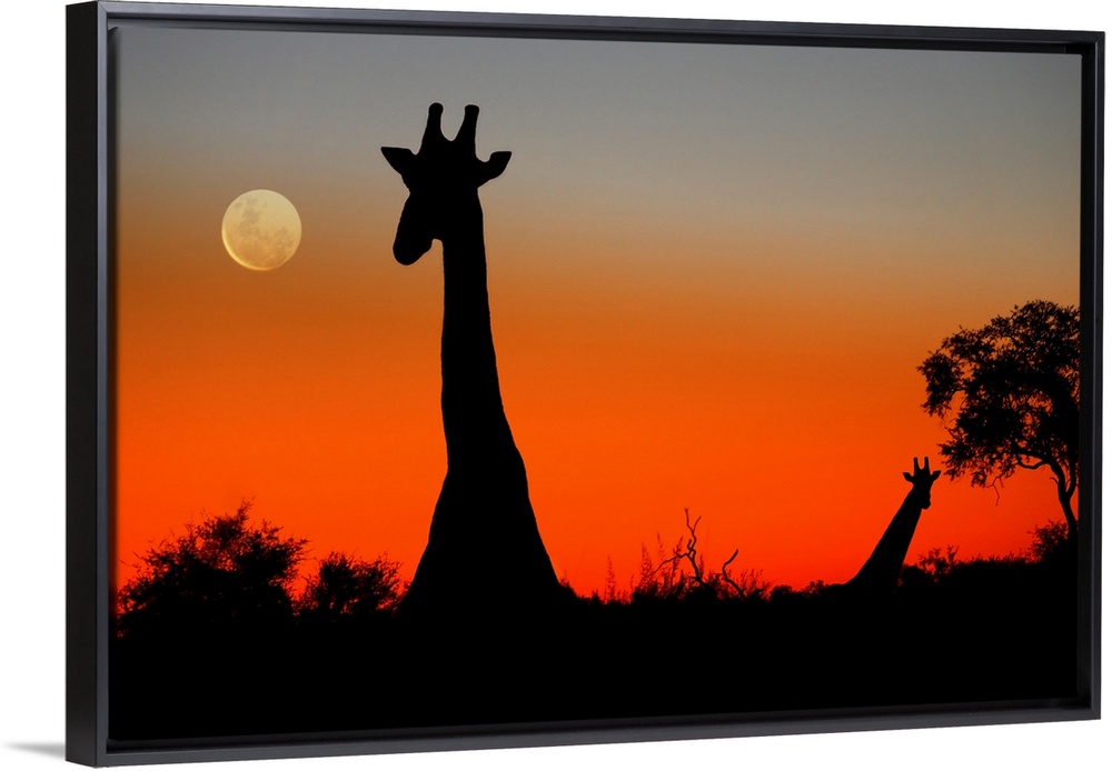 <p>Two Giraffes (Giraffa camelopardalis) in the Savuti area of Botswana as the sun sets and the moon rises</p>