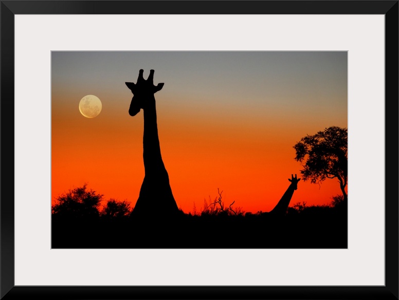 <p>Two Giraffes (Giraffa camelopardalis) in the Savuti area of Botswana as the sun sets and the moon rises</p>