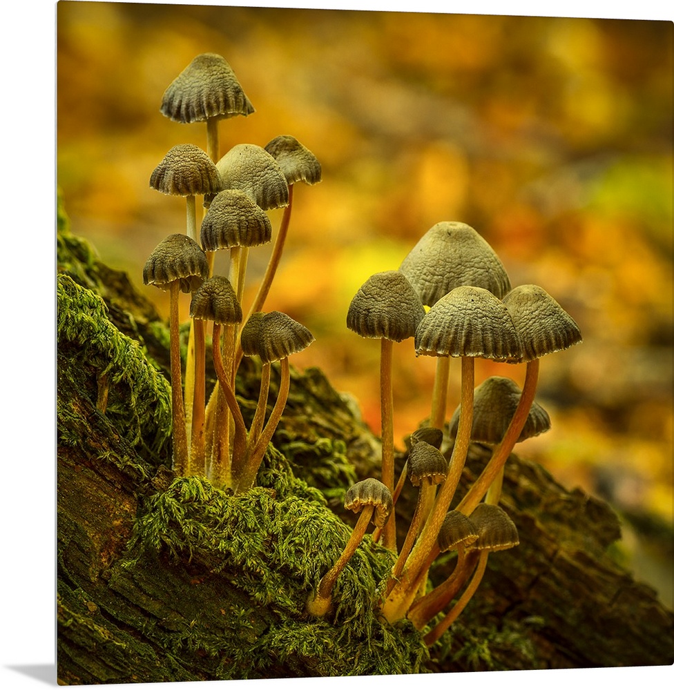 <p>Two clusters of little mushrooms growing on a mossy log.</p>