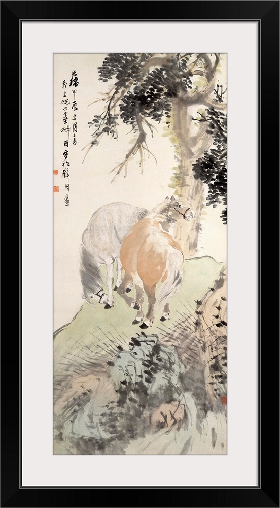 <p>Woodblock print of two horses on a rocky cliff under a tree.</p>