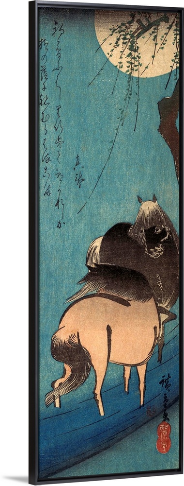 <p>Woodblock print of two large horses near a tree with a full moon.</p>