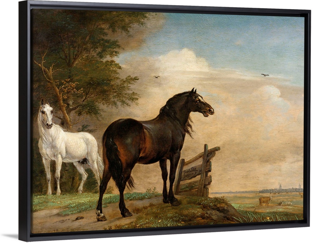 <p>Two Horses in a Meadow Near a Gate, by Paulus Potter, 1649, Dutch painting, oil on panel. The horses are on a low hill before a meadow landscape with cattle and the town of Delft in the distance.</p>