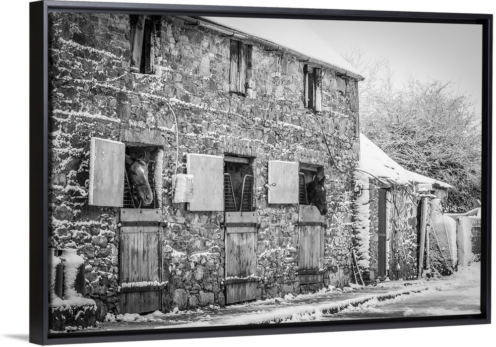 <p>Black and white image of two horses (Equus Caballus) looking out of an old snow-covered stone stable building in winter; Rathcormac, County Cork, Ireland.</p>