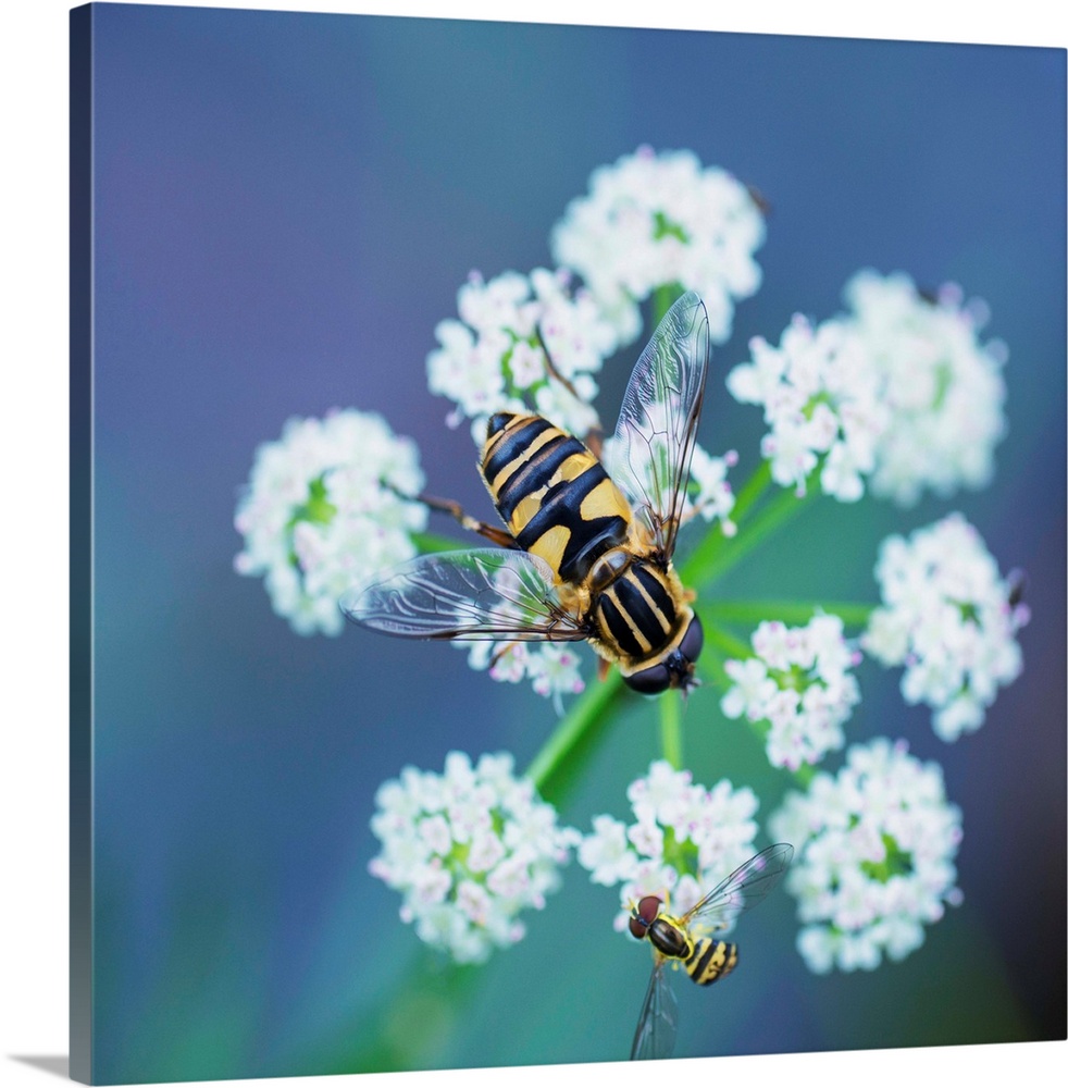 <p>Two hover flies on a white wildflower; Ontario, Canada</p>