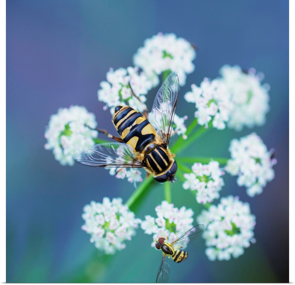<p>Two hover flies on a white wildflower; Ontario, Canada</p>