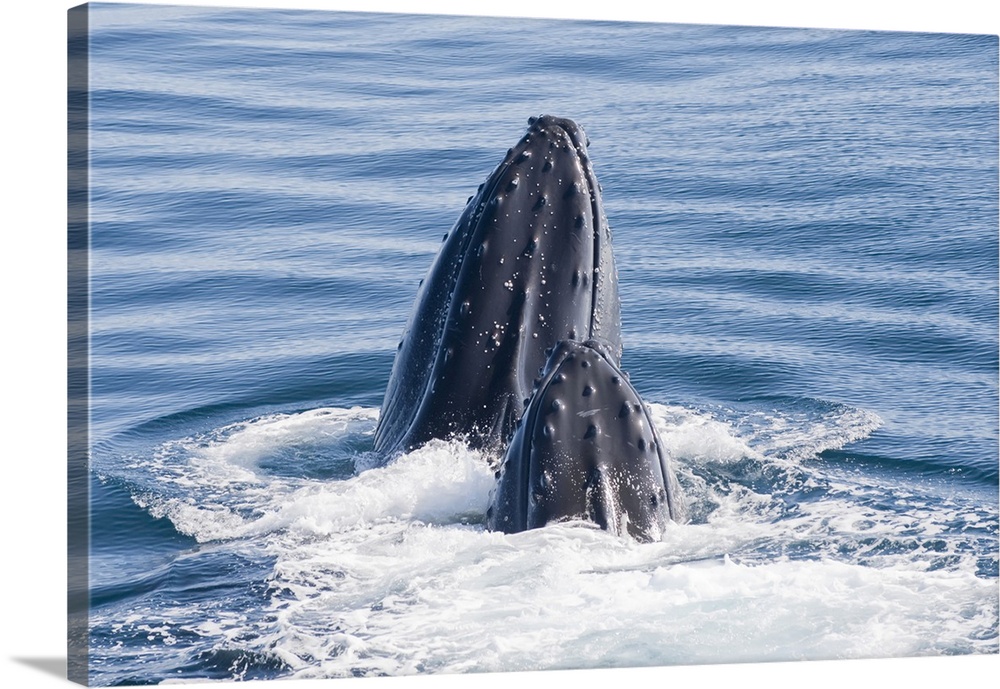 <p>Close-up portrait of two humpback whales (Megaptera novaeangliae) surfacing and splashing in the water of the Southern Ocean off of Antarctica Southern Ocean, Antarctica</p>