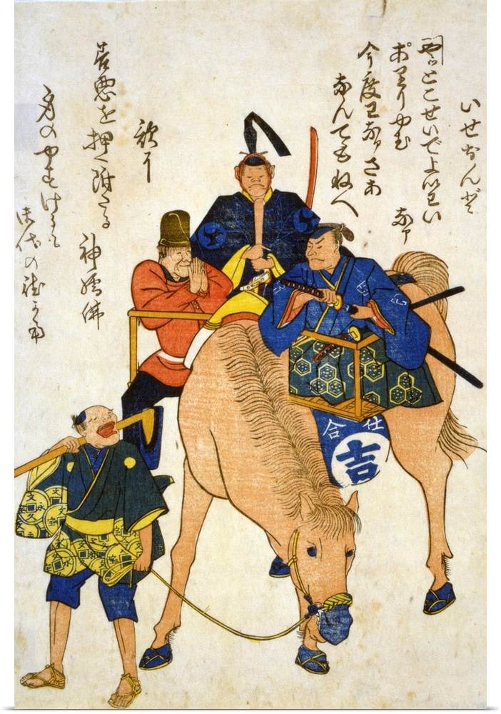 <p>Print on hosho paper, woodcut, colour, of Two Japanese men and one foreigner riding on a horse while a Japanese farmer walks.</p>