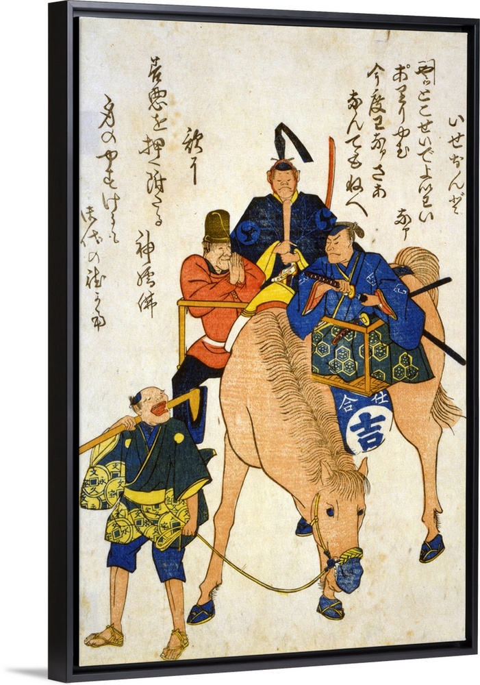 <p>Print on hosho paper, woodcut, colour, of Two Japanese men and one foreigner riding on a horse while a Japanese farmer walks.</p>