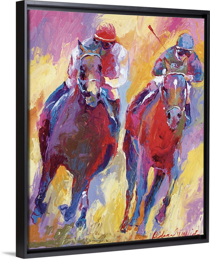 <p>Contemporary vibrant colorful painting of a jockey on horseback.</p>