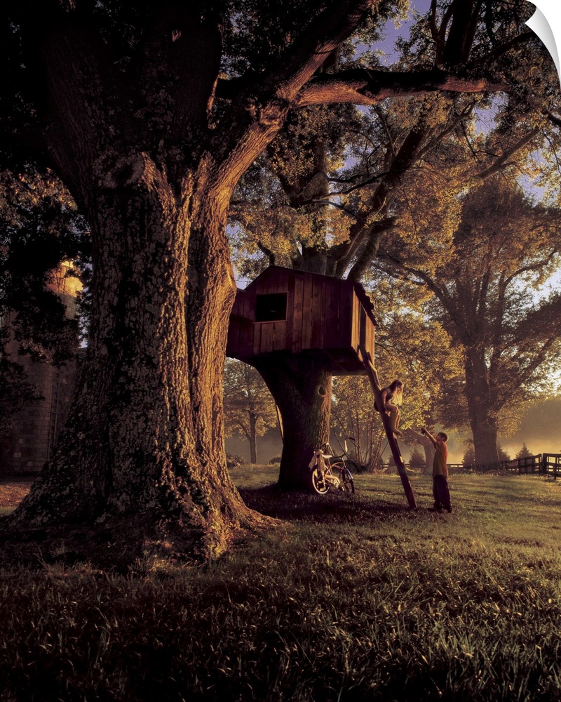 <p>Two kids play on a treehouse on a rural farm in North Carolina</p>