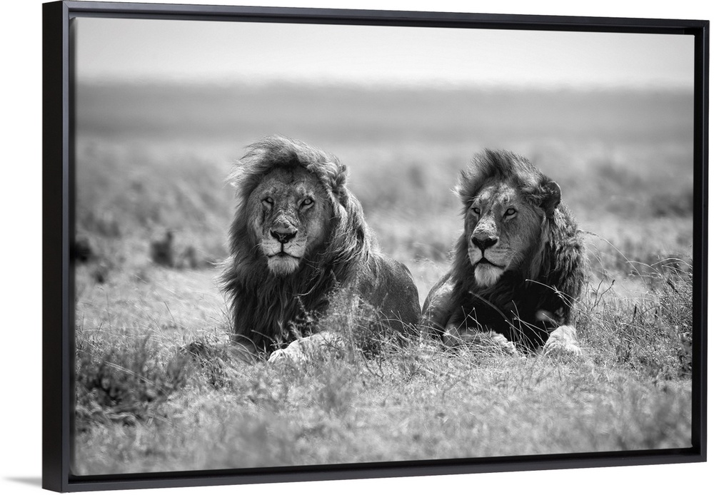 <p>Black and white photograph of two male lions enjoying a breeze on the savannah in Tanzania.</p>