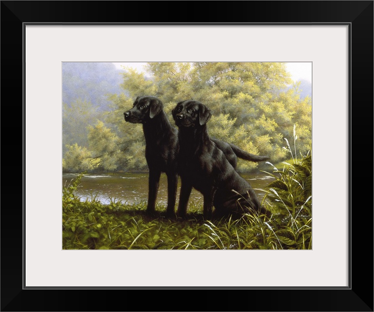 <p>Contemporary painting of two black labs beside a stream.</p>