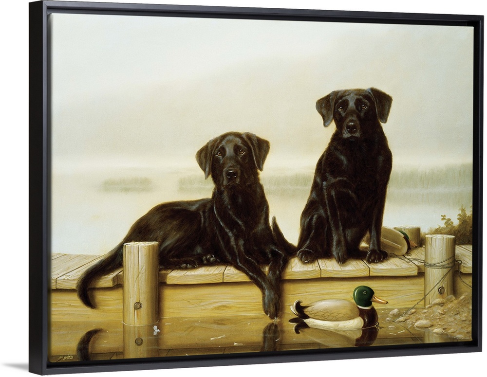 <p>Contemporary painting of a pair of black Labrador retrievers sitting on a dock.</p>