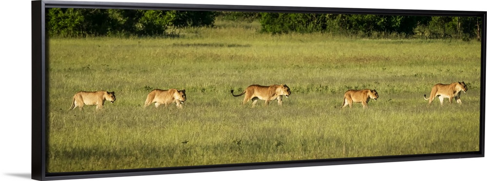 <p>Panorama of two lionesses and three cubs (Panthera leo), Grumeti Serengeti Tented Camp, Serengeti National Park; Tanzania</p>