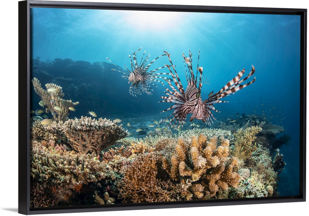 <p>Two Lionfish (Pterois volitans) search over hard coral for a meal at the edge of a drop off; Philippines.</p>
