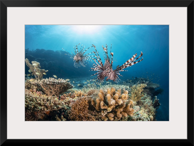 <p>Two Lionfish (Pterois volitans) search over hard coral for a meal at the edge of a drop off; Philippines.</p>