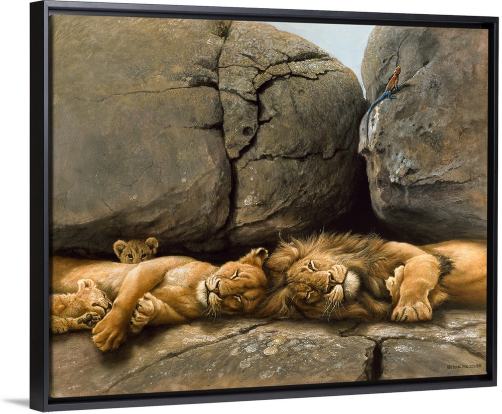 <p>Two lions sleeping on rocks, baby lion in background.</p>