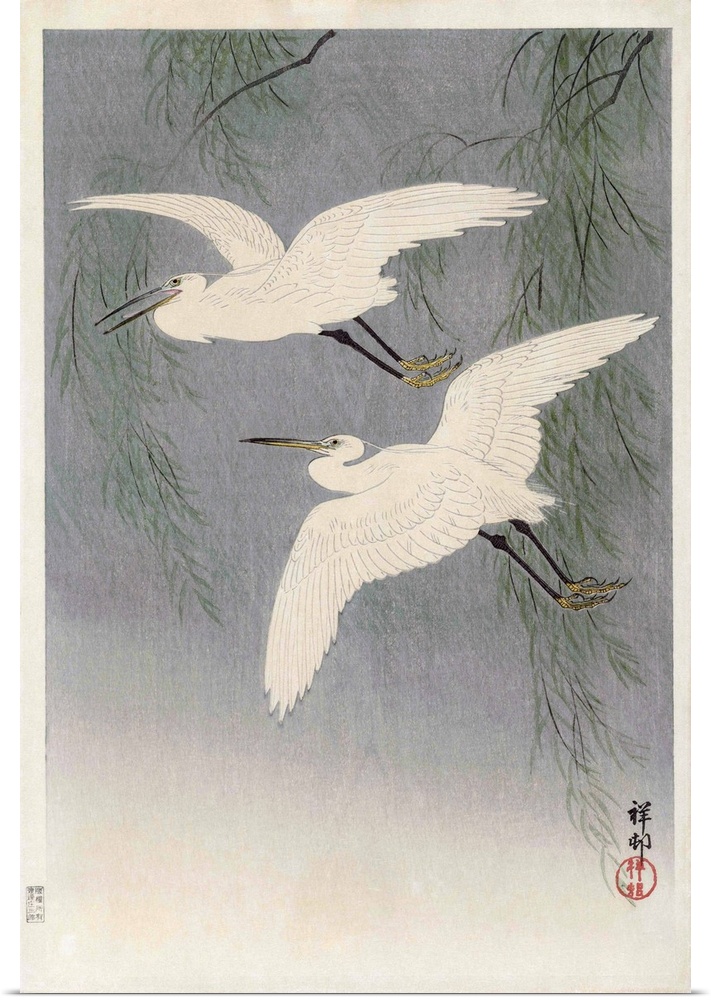 <p>Two Little Egrets in Flight, by Japanese artist Ohara Koson, 1877 - 1945. Ohara Koson was part of the shin-hanga, or new prints movement.</p>